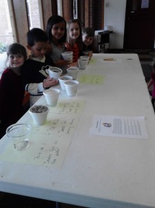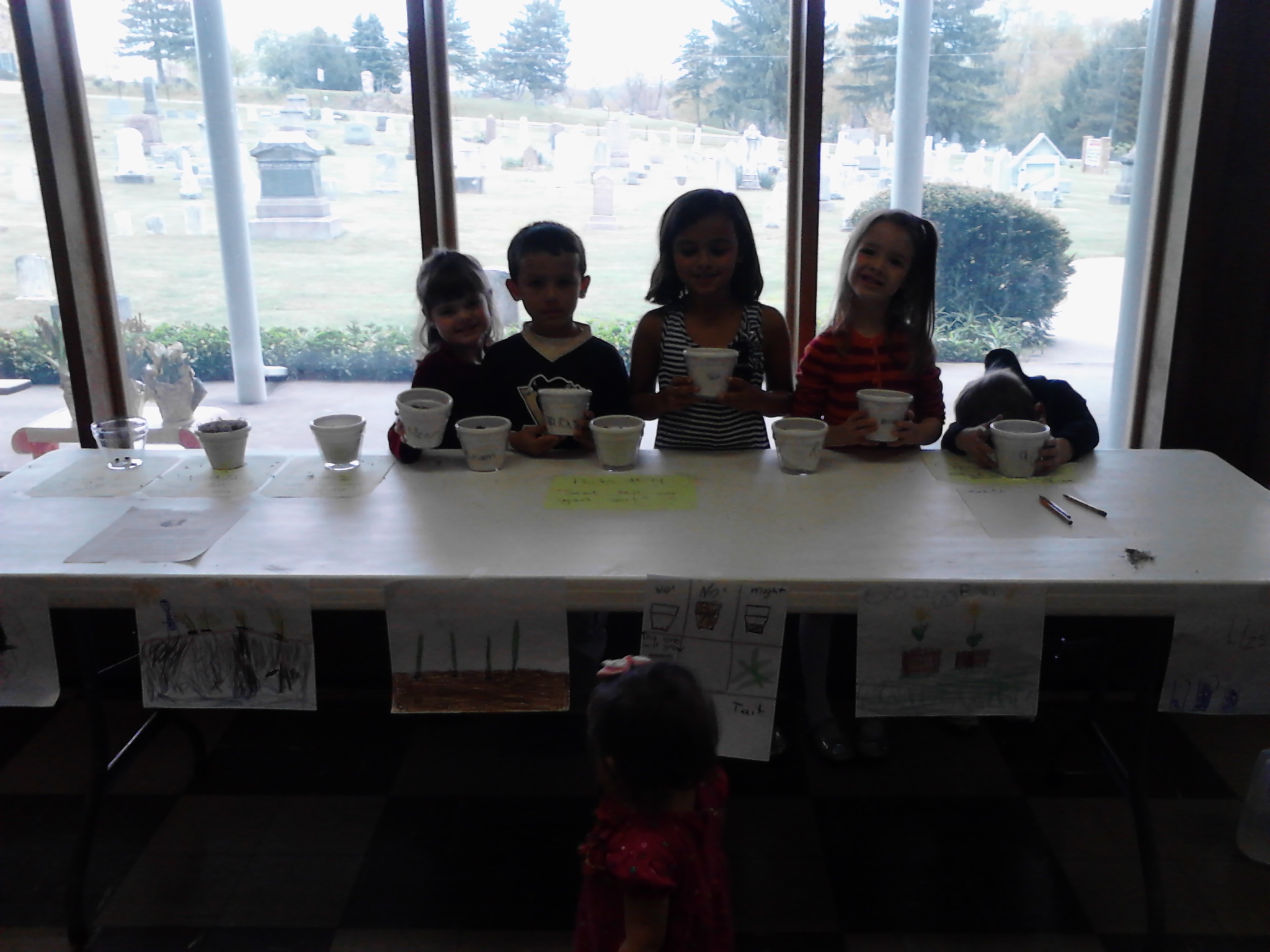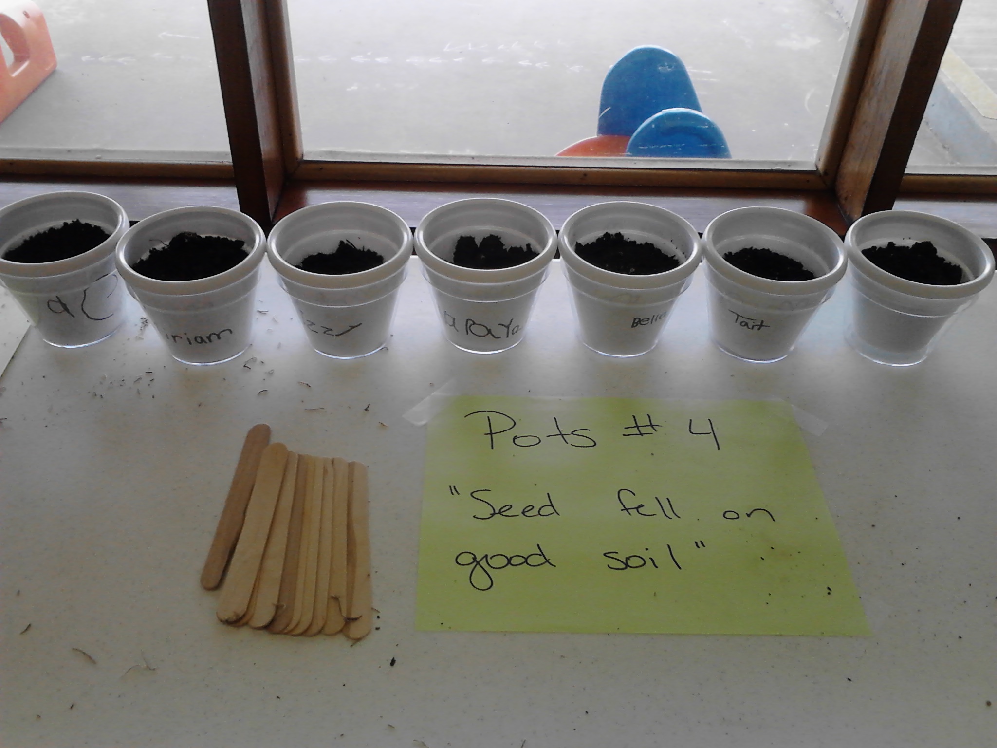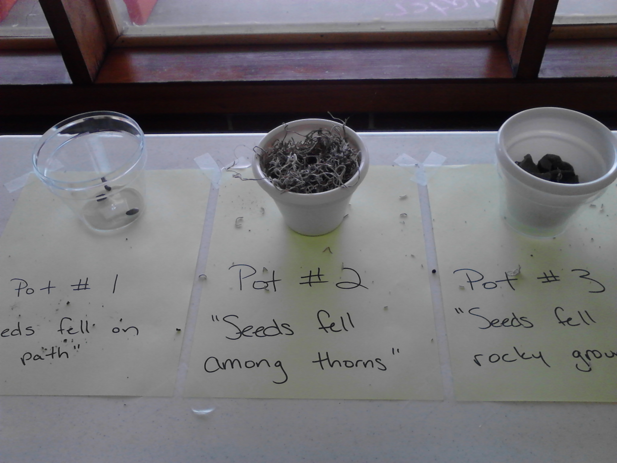 In the parable, some seeds fell on the path where birds took them away, some seeds fell among thorns where they were choked out and unable to grow, some seeds fell on rocky ground where they grew up quickly but then died. We had three pots at our table to represent these seeds. Then the children planted their seeds in good soil.