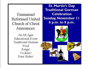 Sunday is also our St. Martin’s Day Festival from 6 to 8 p.m. This is an exciting event that we get from our German Churches. St. Martin’s Day is an evening holiday, full of sweets, hot chocolate, German food, etc. Bring a dish to pass. There will be games and pony rides for the kids. Also, bring a flashlight! A major part of St. Martin’s Day is a home-made nighttime parade!