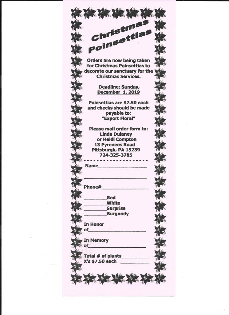 If you would like to order Poinsettias, print out the above order form or call the number listed above, 724-325-3785. There are four colors: Red, White, Surprise, and Burgundy. If you have any questions, call the church office.