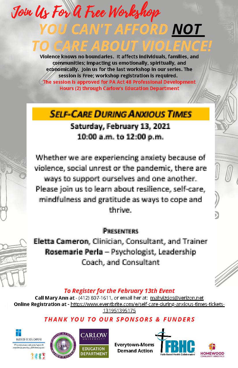 “Self-Care during Anxious Times” Virtual Workshop” Blessed Be Educators, together with five other faith-based organizations, is offering the online workshop “Self-Care during Anxious Times” on Saturday, February 13, 2021 from 10:00 am to Noon. Presenters Ms. Eletta Cameron, Licensed Social Worker, and Ms. Rosemarie Perla, Licensed Psychologist will facilitate an interactive workshop. Join us to learn ways to cope and thrive during this difficult time. To register by February 11th contact Mary Ann Hvizdos (412-807-1611 or mahvizdos@verizon.net). This workshop is approved for two PA Act 48 Professional Development Hours.
